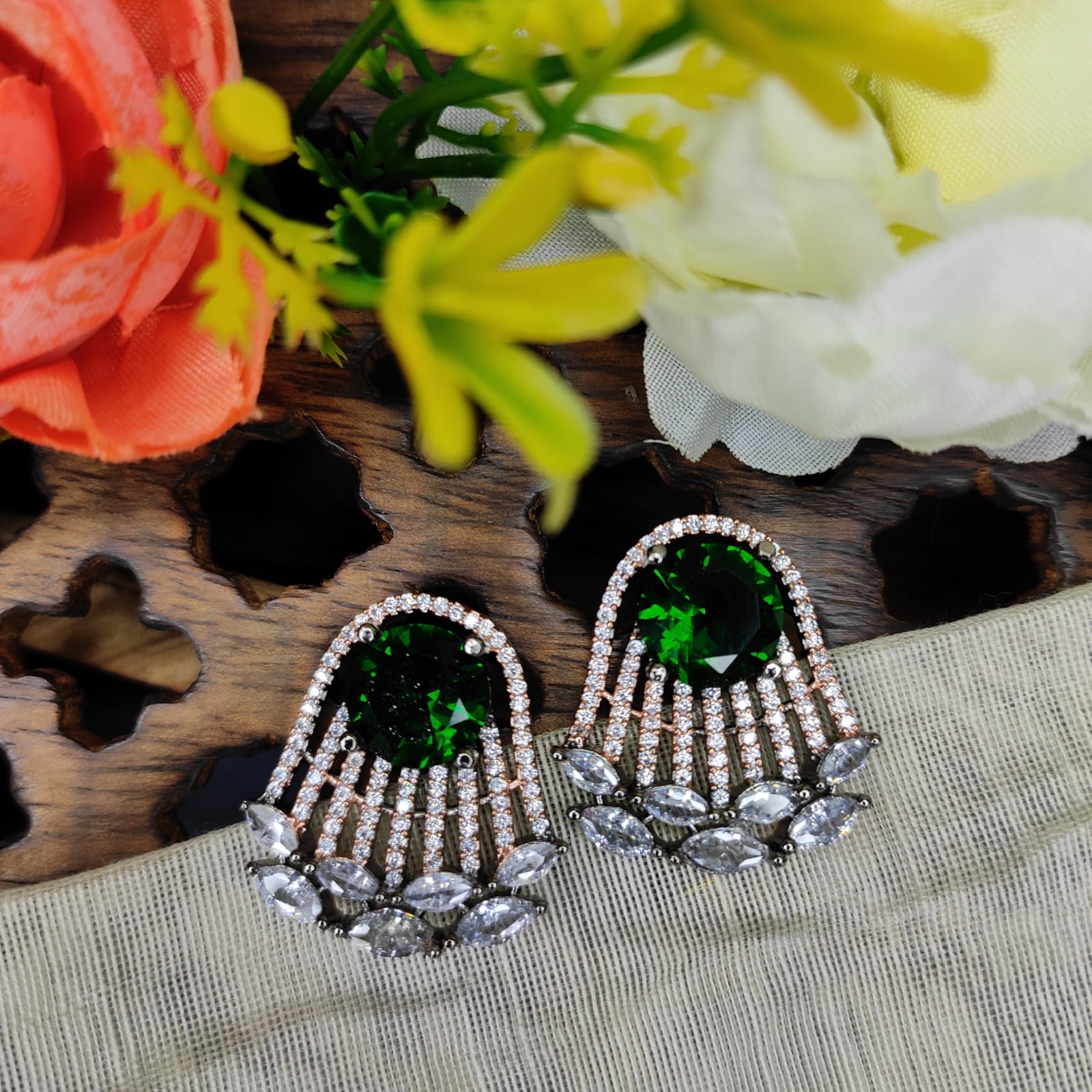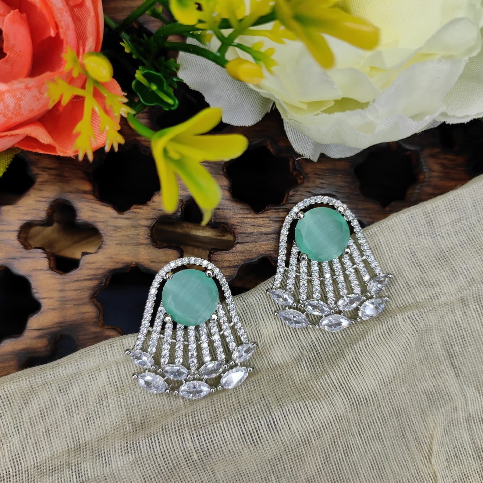 The Nitara AD Stone flower Earrings with Silver Plating in Green are a lovely accessory that can add a pop of color and elegance to any outfit. Whether you're looking to add a touch of glamour to a casual look or complement a formal ensemble, these earrings are a stylish choice.