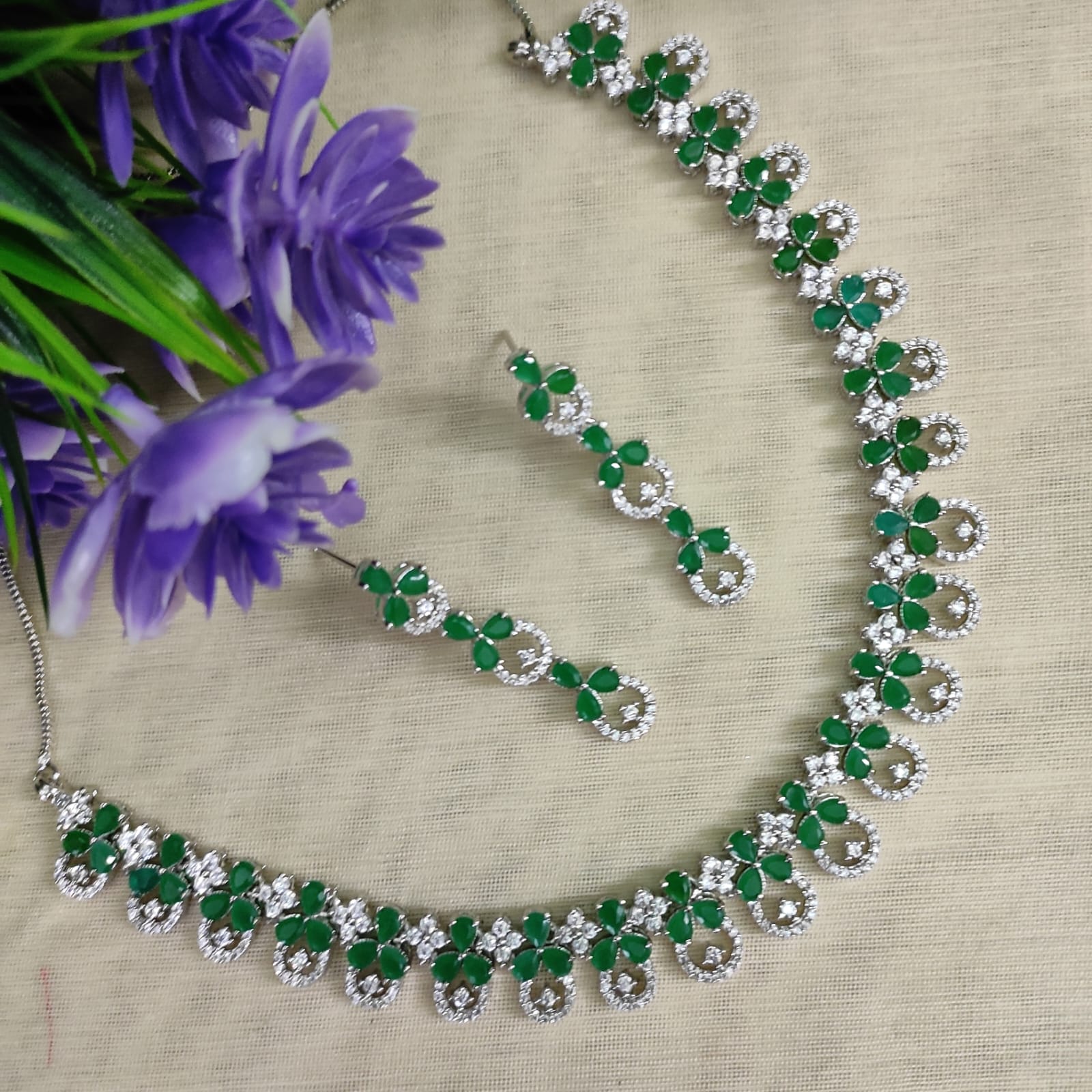 An AD stone necklace set with earrings typically refers to a set of jewelry that includes a necklace adorned with AD (American Diamond) stones and matching earrings. AD stones are synthetic stones that resemble the look of real diamonds, offering an affordable alternative.