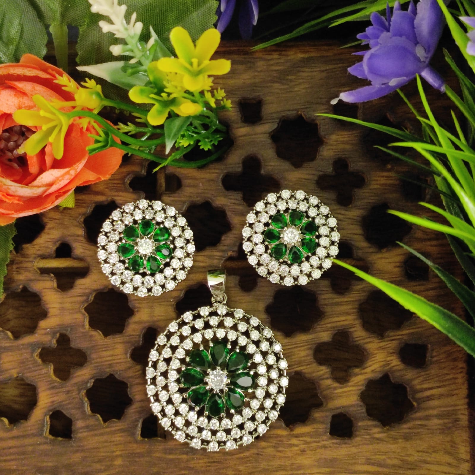 Earrings Design: The earrings in the set will complement the pendant and usually have a matching design. They may feature AD stones set in a silver-plated base, following a similar style or motif as the pendant.